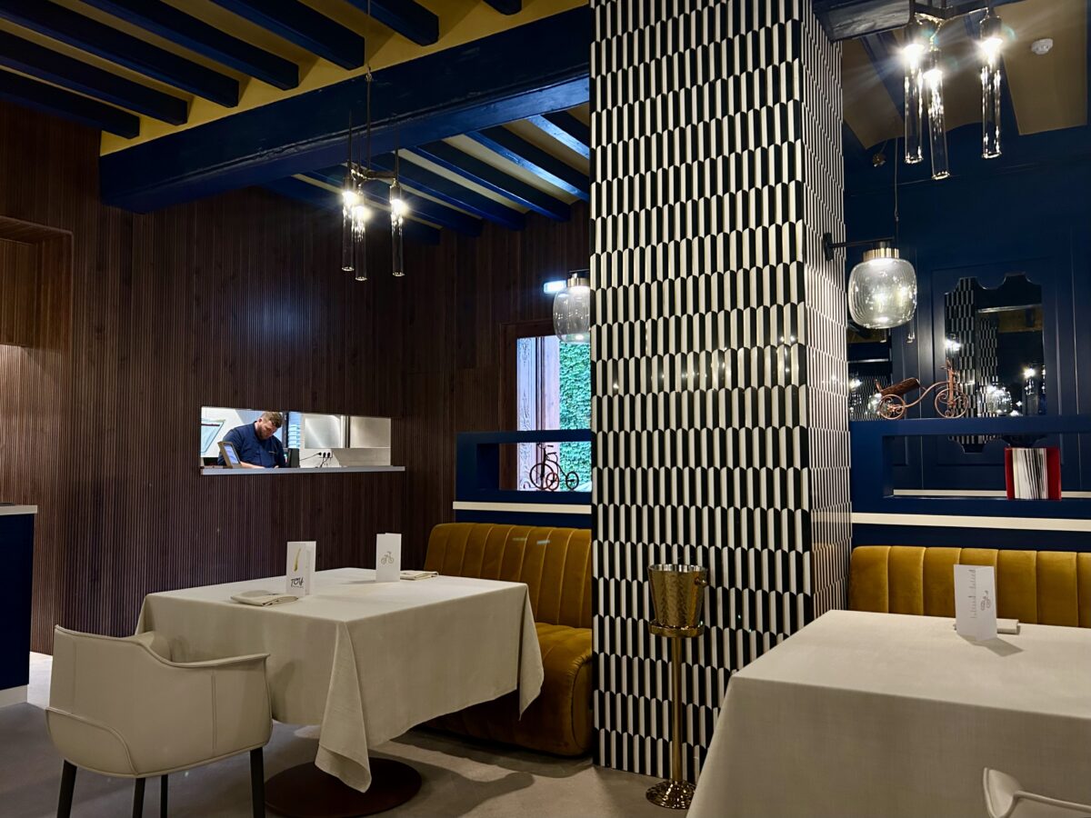 Inside the restaurant, the first thing guests notice is the design. It’s elegant but full of character. Original wooden beams have been preserved and painted in deep blue and gold, the signature colours of the brand. These beams stretch across the ceiling, giving warmth and texture to the room. Art deco-style tiles in black and dark blue add contrast, while subtle touches throughout the restaurant nod to the building’s past as a toy factory. It feels modern and luxurious, but still playful in spirit.